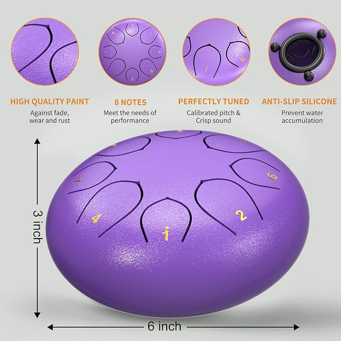 • HIGH-QUALITY CRAFTSMANSHIP: Expertly crafted, this 6-inch chakra drum for rain is made from titanium alloy and coated with paint for exceptional corrosion and rust resistance, and can withstand various weather conditions. Each steel tongue drum is hand-tuned and precisely cut to ensure achieve accurate tones and harmonies.