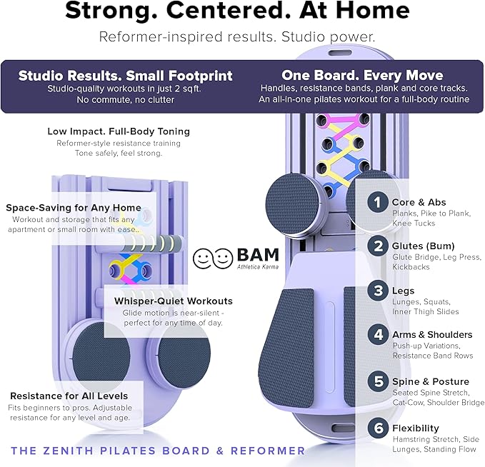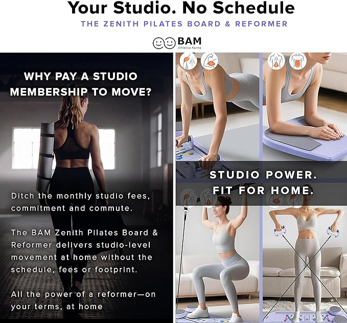 • π—™π—’π—Ÿπ——π—”π—•π—Ÿπ—˜ π—£π—œπ—Ÿπ—”π—§π—˜π—¦ π—₯π—˜π—™π—’π—₯π— π—˜π—₯ π— π—”π—–π—›π—œπ—‘π—˜ 𝗙𝗒π—₯ π—¦π— π—”π—Ÿπ—Ÿ π—¦π—£π—”π—–π—˜π—¦ & π—›π—’π— π—˜ π—šπ—¬π— π—¦ | The BAM Athletica Zenith is a compact Pilates reformer and board built for real-life home workoutsβ€”whether you're in a small condo, apartment or shared space. The reformer folds completely flat in seconds and tucks easily under most beds & closets. Lightweight & sturdy, it's ideal for those looking for Pilates equipment for small spaces without compromising performance.