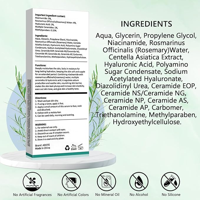 • Special Ingredients : Aqua, Glycerin, Propylene Glycol, Niacinamide, Rosmarinus Officinalis (Rosemary) Water, Centella Asiatica Extract, Hyaluronic Acid, Polyamino Sugar Condensate, Sodium Acetylated Hyaluronate, Diazolidinyl Urea, Ceramide EOP, Ceramide NS/Ceramide NG, Ceramide NP, Ceramide AS, Ceramide AP, Carbomer, Triethanolamine, Methylparaben, Hydroxyethylcellulose. Aqua, Glycerin, Propylene Glycol, Niacinamide, Rosmarinus Officinalis (Rosemary) Water, Centella Asiatica Extract, Hyaluronic Acid, Polyamino Sugar Condensate, Sodium Acetylated Hyaluronate, Diazolidinyl Urea, Cera… See more