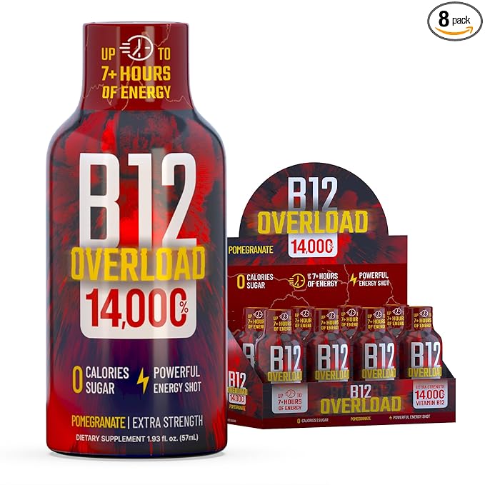 B12 Overload Extra Strength Energy Shot – Pomegranate – 260mg Caffeine, 14000% B12, Electrolytes – Energy & Vitality Support – Zero Sugar No Calories – Vegan, Kosher, Gluten-Free – 1.93 fl oz, 8-Pack