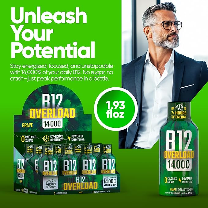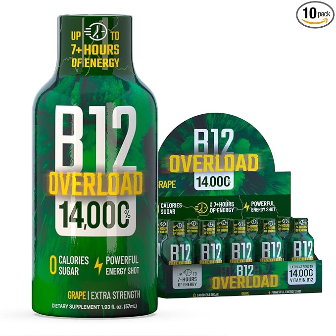 B12 Overload Extra Strength Energy Shot – Grape – 260mg Caffeine, 14000% B12, Electrolytes – Energy & Vitality Support – Zero Sugar No Calories – Vegan, Kosher, Gluten-Free – 1.93 fl oz, 10-Pack