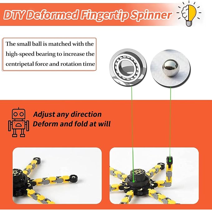 • Transformable Fidget Spinners: Each fidget spinner has six deformable chains. Each of the links can pivot and lock into 5 positions, you can create any shapes you want, such as various shapes of spinners, robots and even mobile phone holders. It can also exercise your kid’s hands-on ability, hand-eye coordination and logical thinking ability by changing the shape of the toys