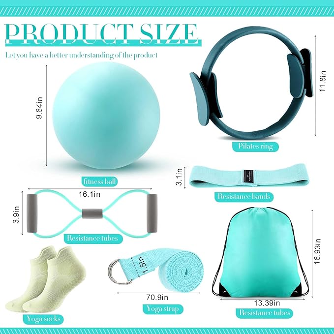 • Suitable Tailored Sizes: understanding that the convenience of exercise equipment lies in the fitting size; The Pilates rings measures 11.81 inches in diameter, the fabric stretching strap is 70.87 x 1.5 inches, the ball 9.84 inches, yoga strap at 23.62 inches in circumference, and the gym back bag is 13.39 x 16.93 inches