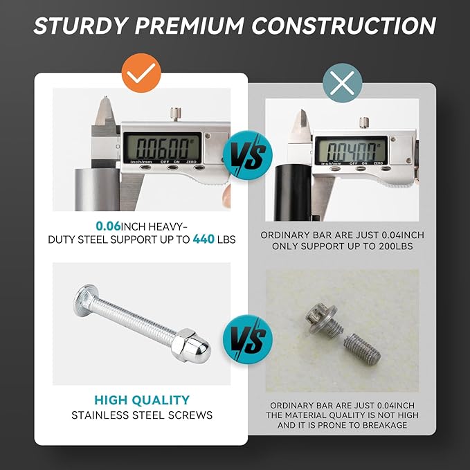 • Sturdy Construction Heavy-duty Bar : Constructed with 1.7mm heavy-duty refinforced steel, the metal chin-up bar ensures sturdiness and reliability, max afford up to 440 pounds ,the bar handgrip has professional-grade comfortable foam for ergonomic gripping.We use high quality self-tighten lock nuts make sure the bar never gets loose