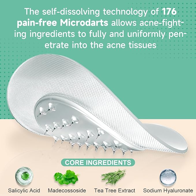 • 【POWERFUL MICRODART TECHNOLOGY】Each patch features 176 ultra-fine microdarts that self-dissolve into deep blemishes, delivering a targeted blend of salicylic acid, madecossoside, tea tree extract and hyaluronic acid to fight acne at its root—reducing redness and swelling overnight.