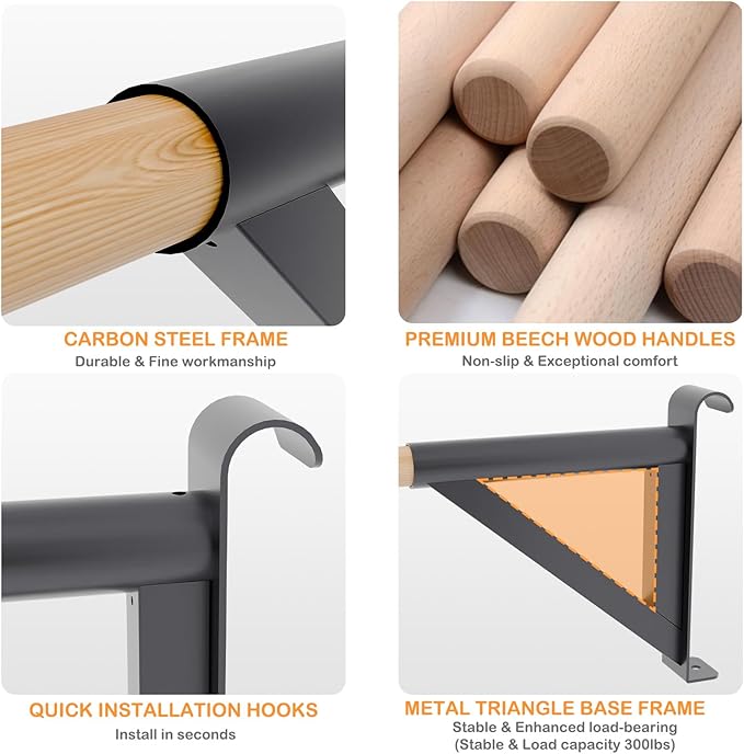 • Professional Grade Material: The Double-bar Handles are crafted from premium beech wood and coated with varnish for enhanced grip and corrosion resistance. They are supported by a carbon steel triangular base frame, delivering exceptional stability and strength with a 330 lb weight capacity.