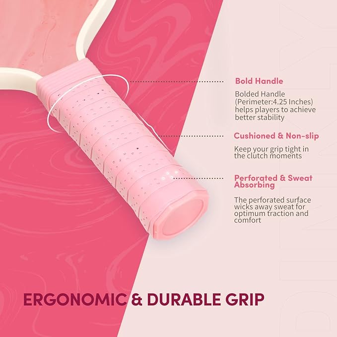• [Ergonomic & Comfortable Grip] The 4.25 inch bold handle fits naturally in your hand, enhancing spin and control. With a 4.9 inch length, it increases power on serves. The breathable and anti-slip grip ensures a firm, sweat-free hold during intense play.