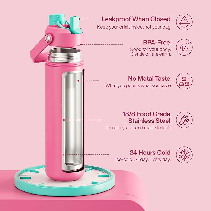 • Cold All Day Long: Our insulated water bottle keeps drinks cold for up to 24 hours. Double-wall stainless steel, zero condensation, just fresh hydration, wherever you go