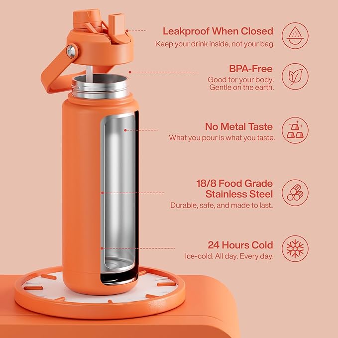 Insulated Water Bottle with Straw Stainless Steel Water Bottle, Leak-Proof, BPA-Free, Double Wall Vacuum Keeps Cold for 24 Hours for Sports, Travel, School (32 oz, Moderate Orange)