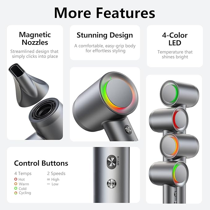 • [Smart Temperature Control] Our hair dryer features an innovative LED ring design that showcases different modes: Red for hot air, Orange for warm air, and Green for cool air. Long-press for alternating hot, warm, and cool air, ideal for all hair types including curly, thick, and fine hair. Additionally, it includes an NTC intelligent temperature control sensor that accurately adjusts the temperature 110 times per second, ensuring a constant temperature to protect your hair from heat damage.