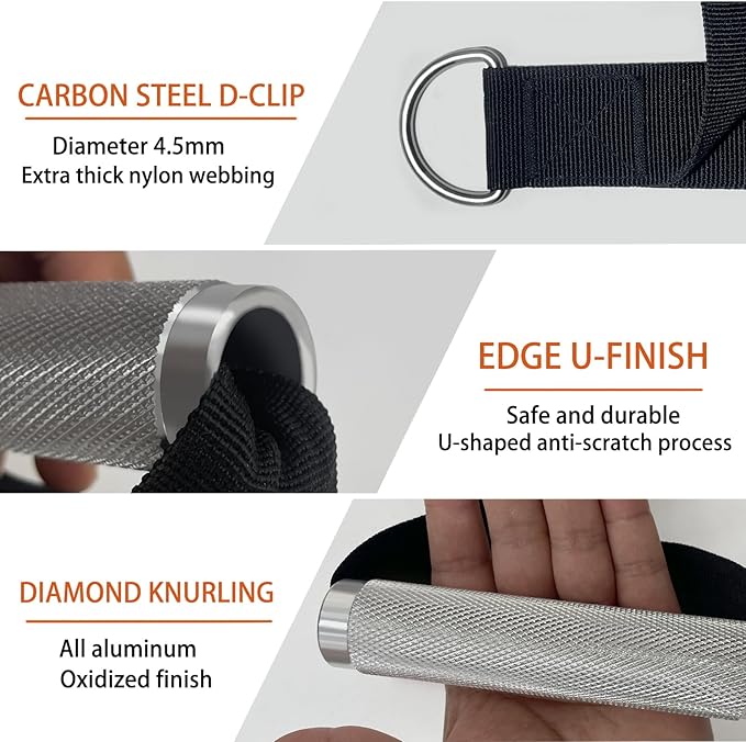 • ULTIMATE GYM ACCESSORIES:WANSPOORTS Enhance your workout with durable aluminum workout Exercise handles and gym grips. These cable handle gym equipment features thick nylon straps, reinforced stitching and ergonomic aluminum core non-slip grips for comfortable use. They are perfect for gym cable attachments, cable machine handles, and resistance band handles, and work well with home gym equipment. Ideal for gym equipment, squat machines and more.