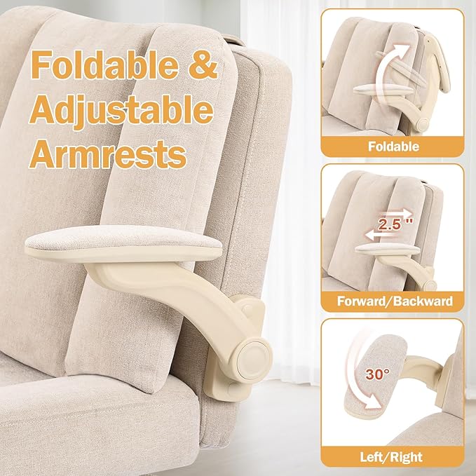 • ADJUSTABLE ARMRESTS: The armrests are foldable and movable, allowing for 2.5” front-to-back and 30° side-to-side angle adjustment. Whether working, gaming, or relaxing, the flexible armrests can be tailored to your needs, providing optimal arm support