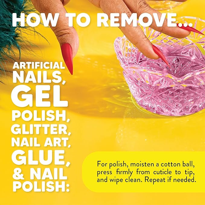 • Directions: Simply clip the artificial nails, and soak your fingers in a bowl of the nail remover for 15 minutes. Gently file down the softened product and soak for another 15. For regular polish, Moisten cotton balls and massage the nail bed