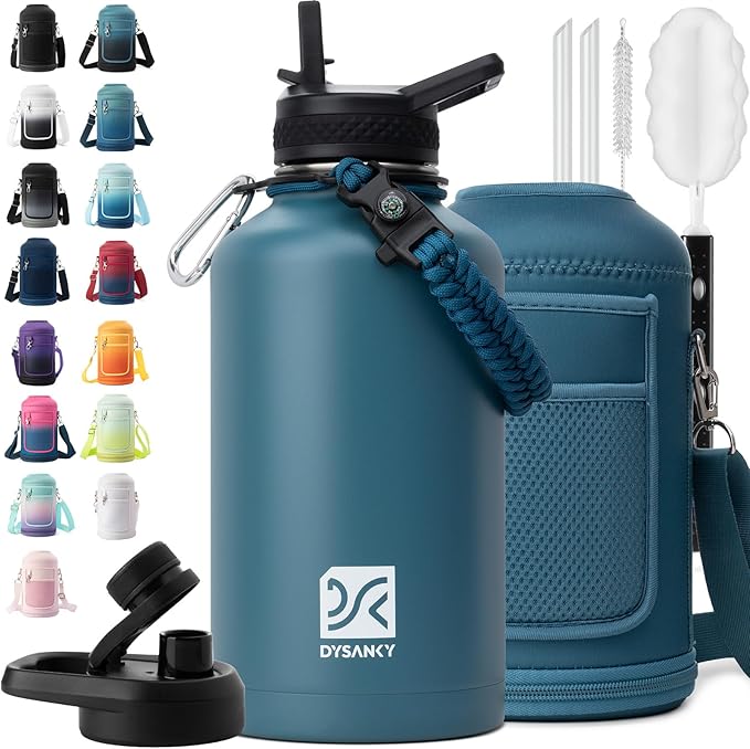 Insulated Water Bottle | Thickened Stainless Steel Vacuum Metal | Portable Sports Half Gallon Large Water Jug for Gym and Hiking with Straw, Carrier Bag, Handle Strap | BPA-Free 64 oz