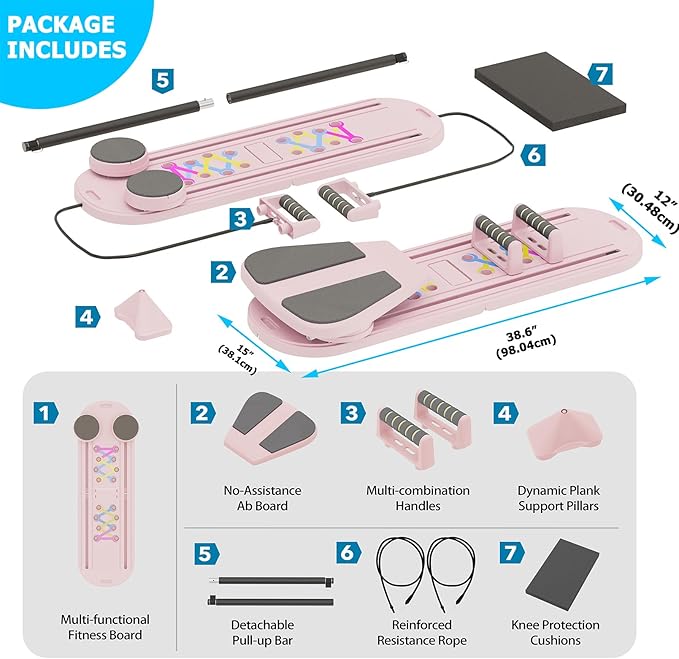 • [6-in-1 Multi-Purpose Pilates Board] Upgrade your workout routine with this all-in-one Pilates reformer set. It combines the functions of a Pilates board, ab roller, resistance bands, push-up handles, balance board, and planks—helping you achieve efficient core, arm, leg, and back training at home.