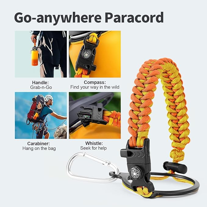 • Palm Fitting Paracord Handle: Compared to handle lids, nylon paracord on the bottle gives you more choices in terms of color coordination and coziness on your hands. Match the handle with your bottle to make a complete outdoorsy look. Compass and carabiner can be lifesavers for hiking and other expeditions