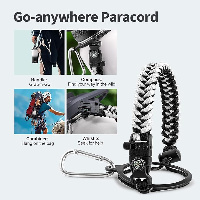• Palm Fitting Paracord Handle: Compared to handle lids, nylon paracord on the bottle gives you more choices in terms of color coordination and coziness on your hands. Match the handle with your bottle to make a complete outdoorsy look. Compass and carabiner can be lifesavers for hiking and other expeditions