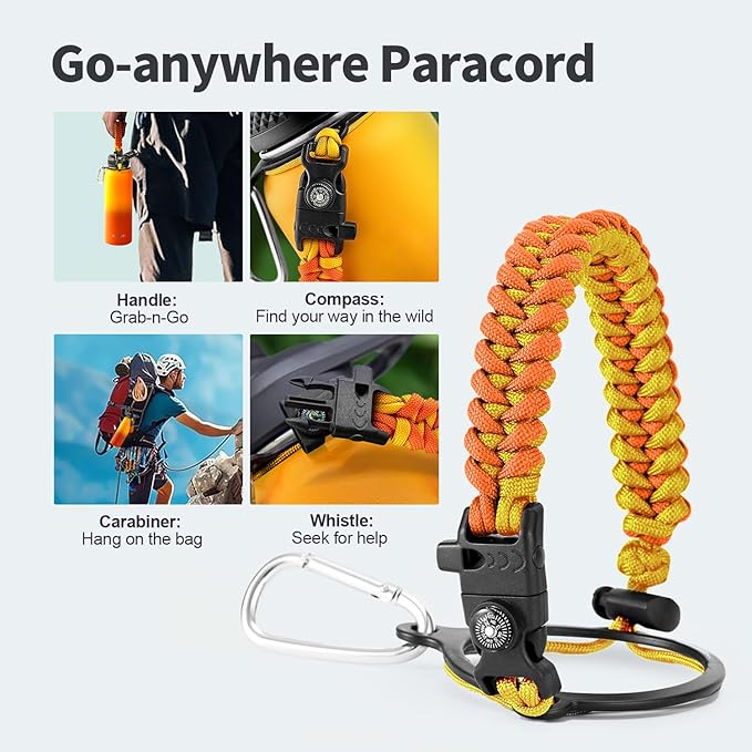 • Palm Fitting Paracord Handle: Compared to handle lids, nylon paracord on the bottle gives you more choices in terms of color coordination and coziness on your hands. Match the handle with your bottle to make a complete outdoorsy look. Compass and carabiner can be lifesavers for hiking and other expeditions