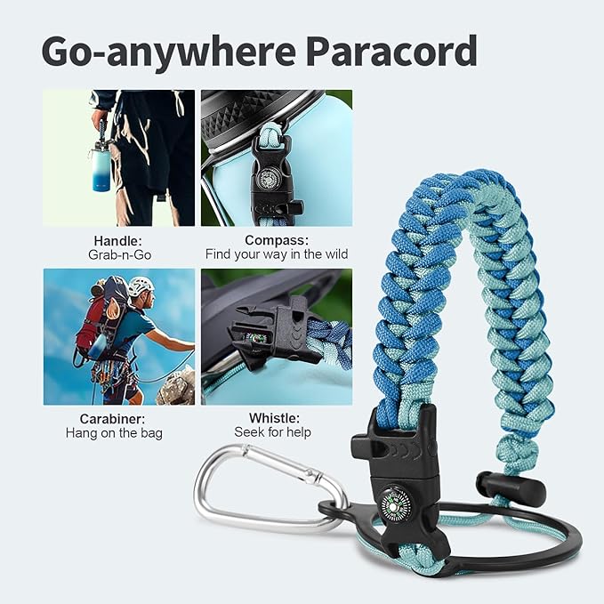 • Palm Fitting Paracord Handle: Compared to handle lids, nylon paracord on the bottle gives you more choices in terms of color coordination and coziness on your hands. Match the handle with your bottle to make a complete outdoorsy look. Compass and carabiner can be lifesavers for hiking and other expeditions