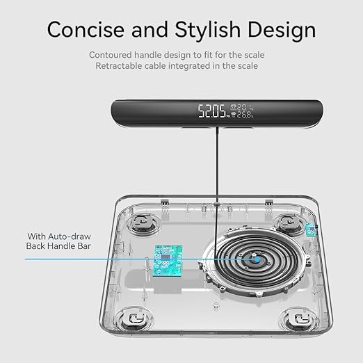• NO MORE LOOKING DOWN: Fitdays bathroom scale features a large, clear 4.1x2.46-inch color display on the retractable handle, allowing you to conveniently view your measurements without having to stare down. In addition to weight, 6 essential body composition will also displayed simultaneously on the screen so you can see them at a glance without opening the app