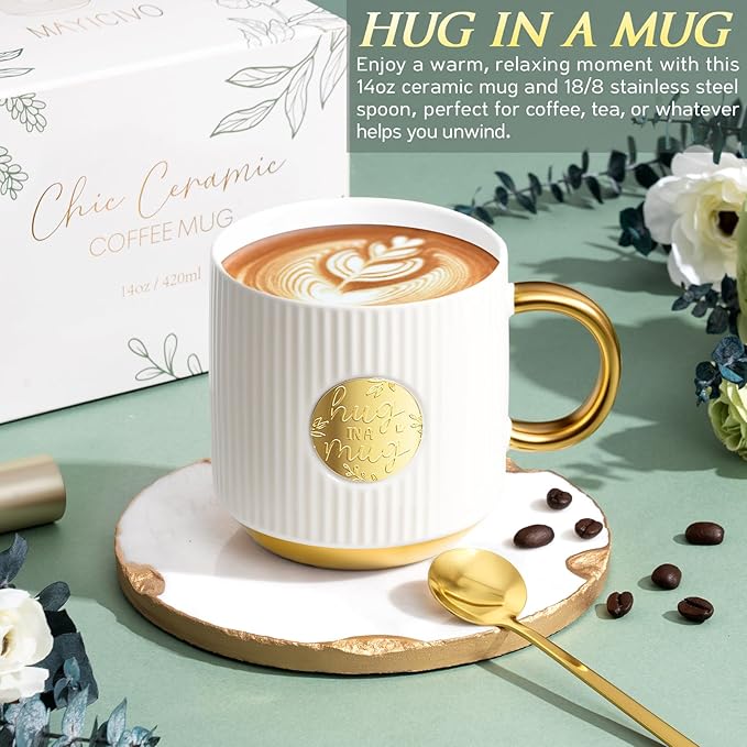 • ELEGANT CERAMIC MUG WITH SPOON: This elegantly designed mug printed with “Hug in a Mug” is made of premium ceramic that is both durable and heat-resistant—perfect for enjoying hot coffee, tea, or any beverage with peace of mind. The sturdy handle offers a comfortable grip, and the 18/8 stainless steel spoon adds a touch of elegance. Ideal for a peaceful morning or a cozy evening moment. A heartfelt care package for women self care gift relaxing comfort gift sending big hug gifts feel better gift