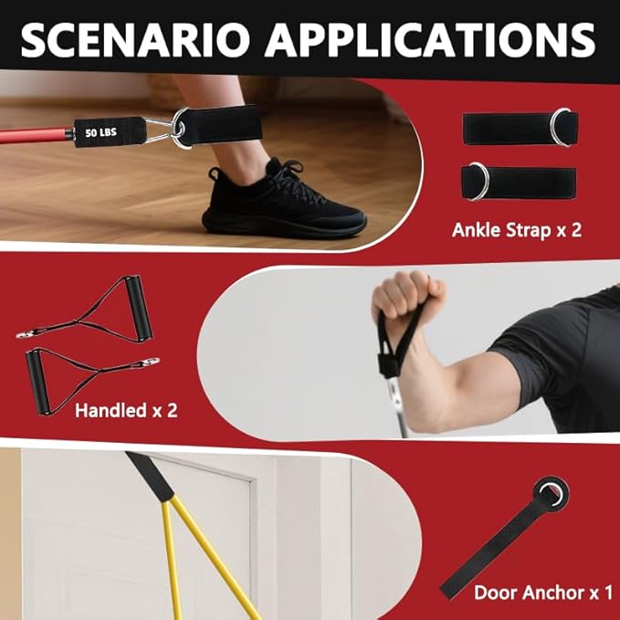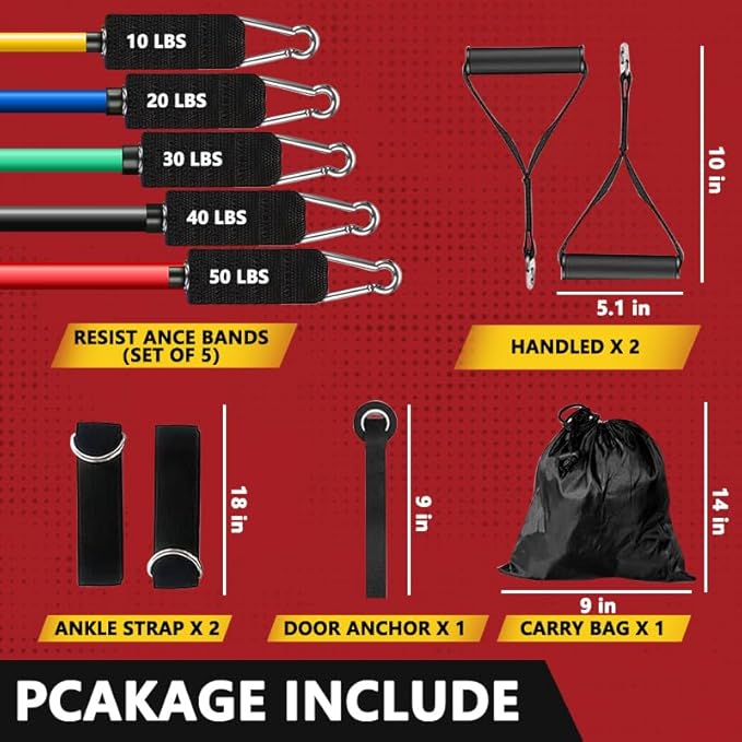 • Resistance Bands Set Includes: 5 exercise bands, 2 cushioned handles, 2 ankle straps, 1 door anchor, 1 carrying bag. No additional equipment is needed for efficient strength training.
