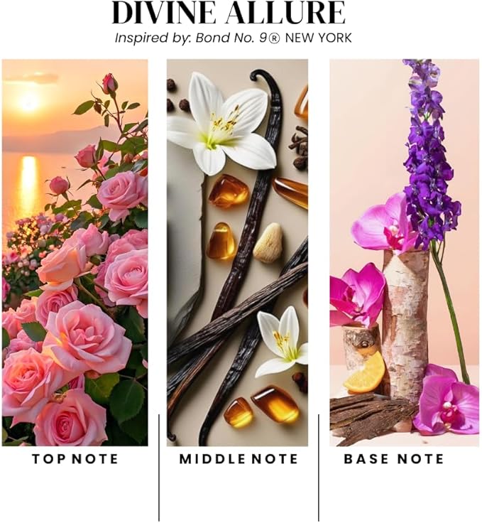 • DIVINE ALLURE Inspired by: BOND N9 New York | A seductive, erotic blend of sultry Eastern woods and intoxicating Western florals, Divine Allure beckons with an irresistible charm. Its rich, smoky warmth swirls with the softness of delicate blossoms, creating an aromatic dance that feels both mystery and elegance, evoking desire with every breath, Sensual, Unforgettable, Totally Divine.