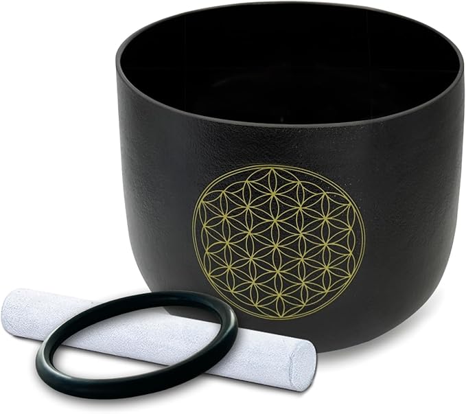 9 inch F Note Flower of Life Black Crystal Singing Bowl Heart Chakra Meditation Sound Healing with Suede Mallet Striker O-ring