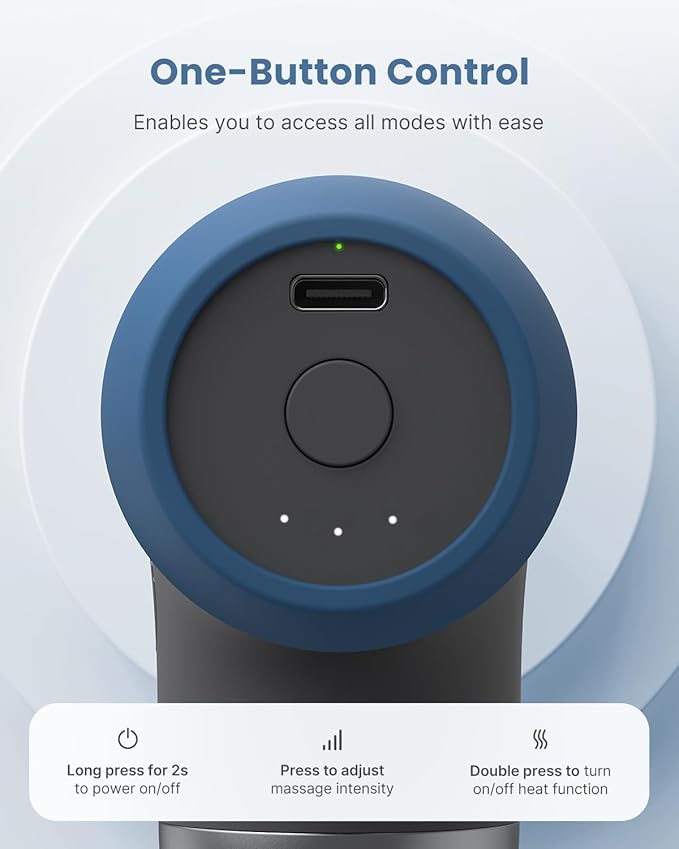 • Effective Heated Massage: Equipped with heat-conductive steel head, the deep tissue massage gun warms up to 46℃/114°F in just 1 minute, effectively reducing muscle tension and soreness.Note:Double press the Power button to enable the heating function. The light is red when the heating function is activated. Do not use the silicone massage head when using the heating function.