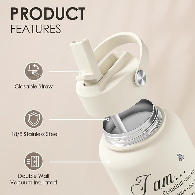 Christian Inspiration Water Bottle 32oz Stainless Steel with Lid & Straw, Inspirarional Insulated Bottles for Women Girls, Religious Inspirational Gift Idea for Birthday Christmas