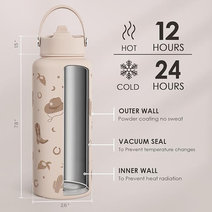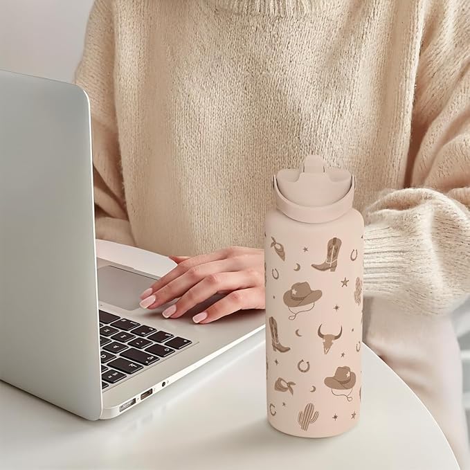 Western Cowgirl Water Bottle 32oz Stainless Steel with Lid, Insulated Bottles for Women Girls, Gift Idea for Birthday Christmas