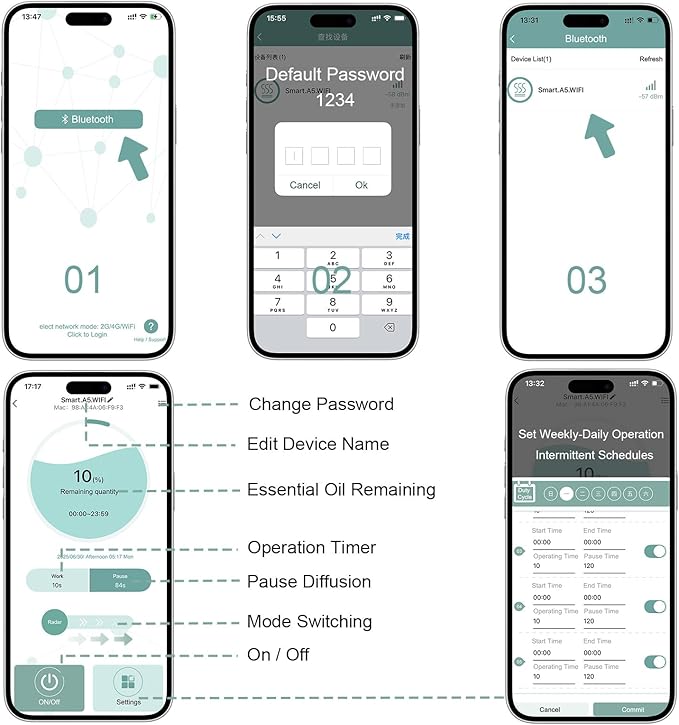 • Smart Bluetooth & WIFI & App Control: Easily control the diffuser through a dedicated mobile app (iOS/Android compatible). Set custom schedules and settings—ideal for homes, offices, hotels, spas, retail spaces, cafes, libraries, and more.
