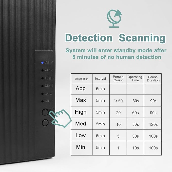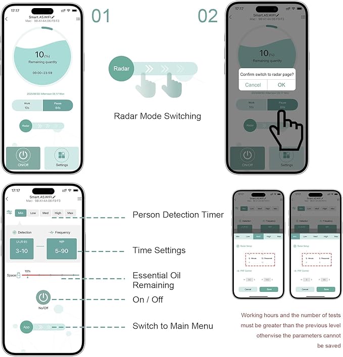 • Radar Sensing Mode: Equipped with radar technology, the diffuser detects human presence and disperses fragrance in a 360° radius, ensuring even and efficient scent coverage throughout the area.