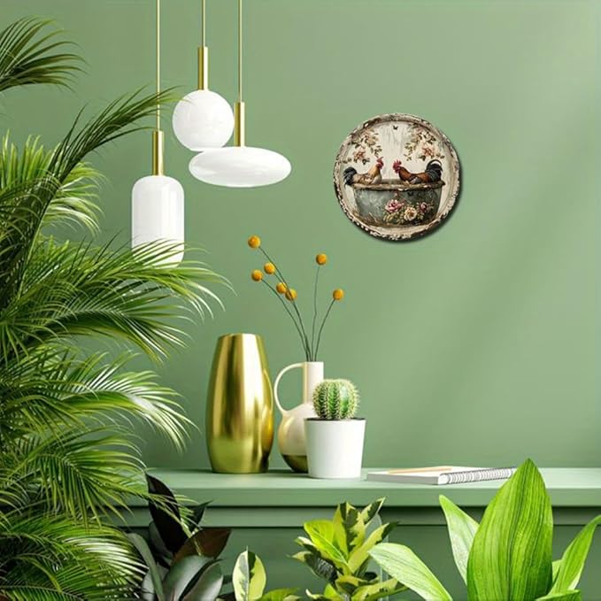 1pc Vintage Round Bathroom Aluminum Metal Decor Sign, 8x8 Inch, Chicken Themed Wreath, Use Without Electricity, No Feathers, with for Home, Living Room Wall Decoration