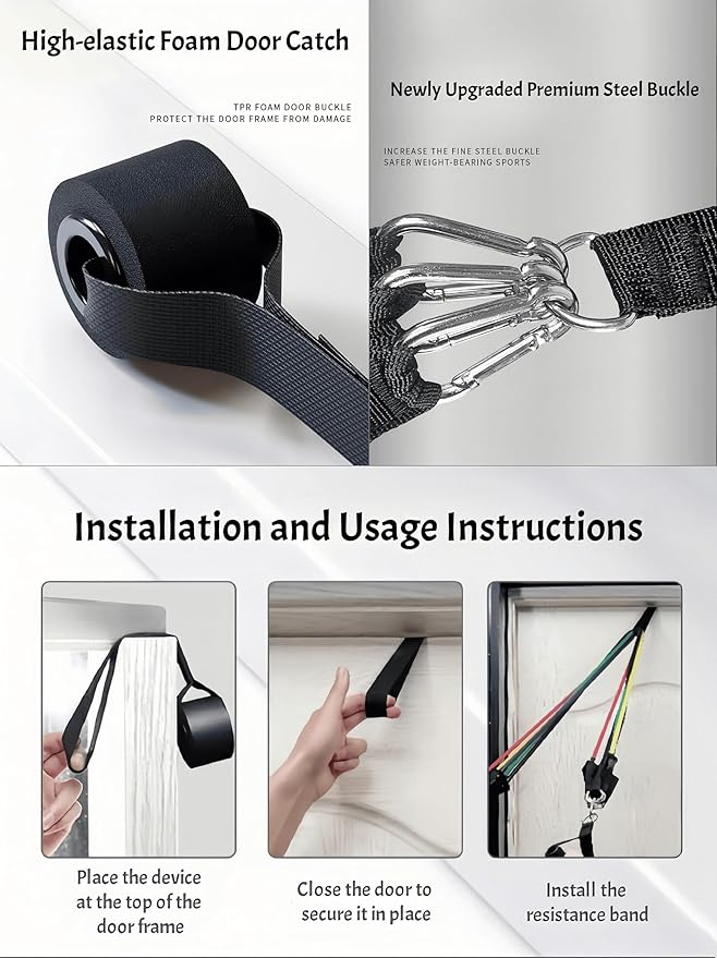 • 6.The foam door anchors provide a secure attachment to any door, enabling you to perform a variety of exercises without worrying about slipping or instability. This feature, combined with the non-slip handles, ensures a safe and effective workout experience for users of all fitness levels.