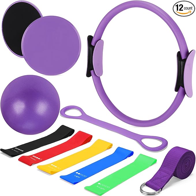 • 6 Exercise Sets: unleash your fitness potential with our comprehensive 6-set Pilates kit! Featuring a 14-inch fitness ring, a 9-inch ball, a 71-inch yoga strap, silicone tension strip, a 5-piece resistance band set, and a pair of sliding discs, these expertly curated essentials cater to both beginners and seasoned practitioners; Elevate your workout routine with these tool, tools designed to enhance your Pilates practice and take your fitness journey to the next level