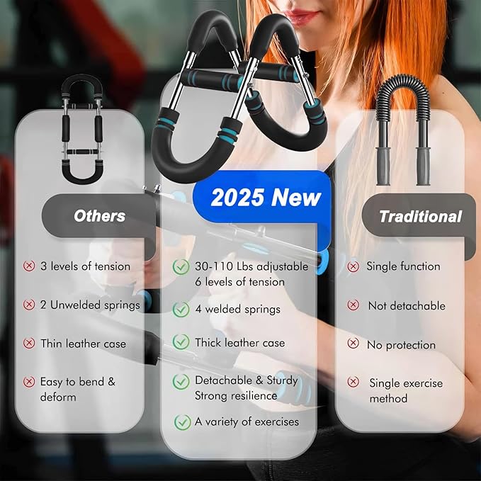 • ✅【2025 Upgraded Twister Arm Trainer】: The 2025 upgraded twister arm trainer features thickened sleeves, 6-level resistance (30-110 lbs), and welded springs for durability. Includes 2 sets (4 springs) for versatile workouts—from rehab to advanced muscle toning. Perfect as twister arm trainer for men/women, home chest workout equipment, and home workout equipment.