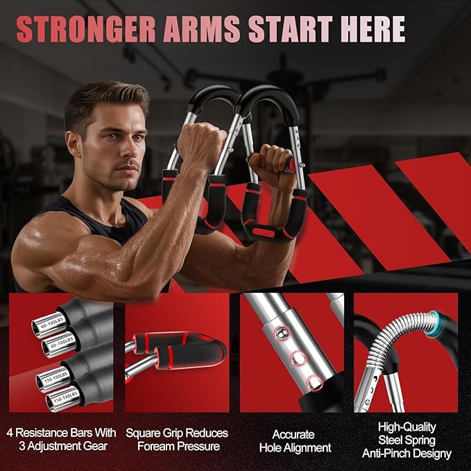 • Two Spring sets, 6 Resistance Levels: Two spring sets (60-100 & 110-150 lbs) and three adjustment holes make this chest workout equipment perfect for beginners or advanced users. Great for strength training, arm trainer for men, and twister-style progressive overload