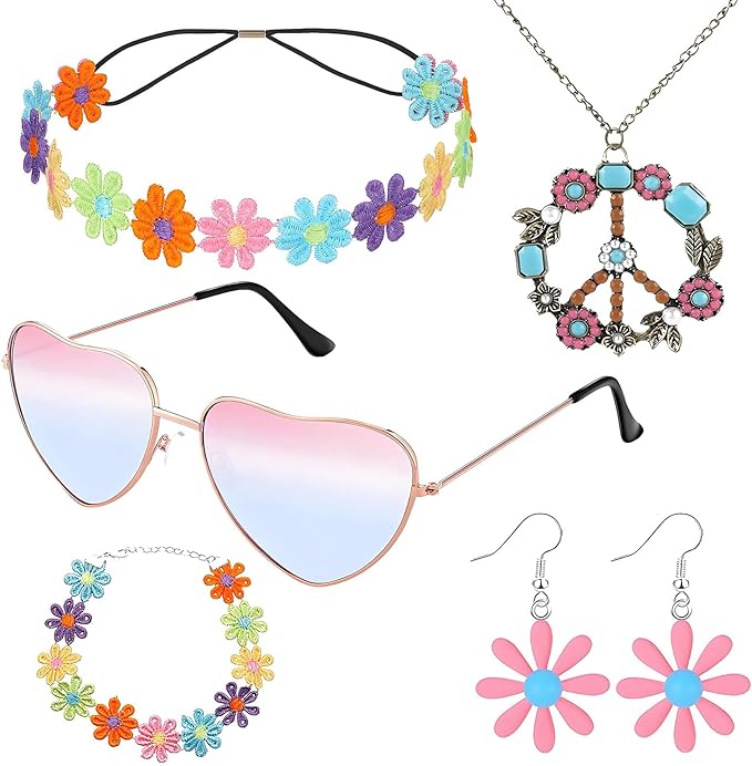 • HIPPIE COSTUME ACCESSORIES: you will receive 1 pieces of hippie flower ring headband, 1 pieces of flower ring wristband, 1 pieces of peace sign necklace, 1 pieces of cordate hippie glasses and 1 pair of flower shape earrings, colorful and vibrant, which can help you achieve an entire hippie outfit, showing your hippie feeling and enjoy the party.