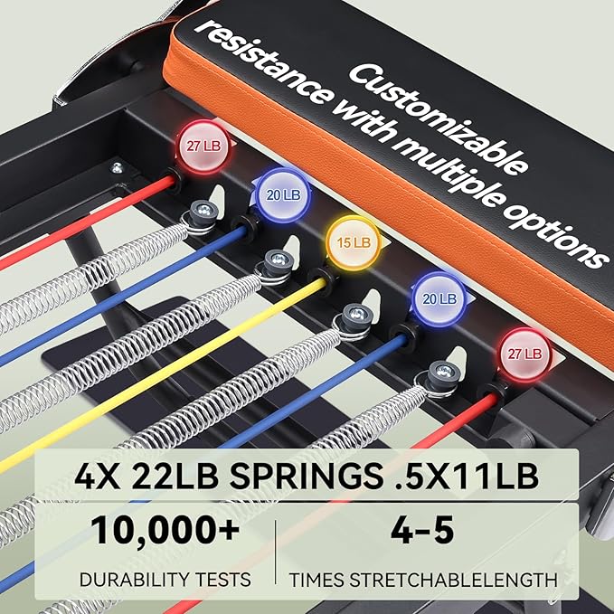 • 【Fully Upgraded】: Foldable Pilates Reformer is equipped with 4 springs and 5 elastic ropes, providing a wide range of adjustable resistance levels. It can easily match physical goals and physical conditions, accurately control exercise intensity, and make each training session advanced
