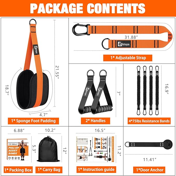 • 【Versatile assisted pull up bands for Fitness 】- It comes with adjustable height straps,4 high quality resistance bands,foot pad sling hanging straps,handle and door anchor which help you achieve various exercise movement as you like.the pouch bag make it easy to carry with after fitness workout,Carrying it conveniently to your home,office,gym or some outdoor occasion