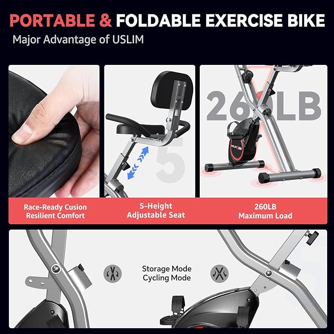 • KEY FEATURES: (1) Our workout bike is designed to accommodate riders from 4'11" to 6'6" in height, with a maximum weight capacity of 300 pounds. (2) The foldable design allows for compact storage, and built-in wheels ensure easy transportation. (3) Equipped with an LCD display, this bike tracks essential metrics such as time, speed, and calories burned. Additionally, it features a convenient phone holder for entertainment during workouts.