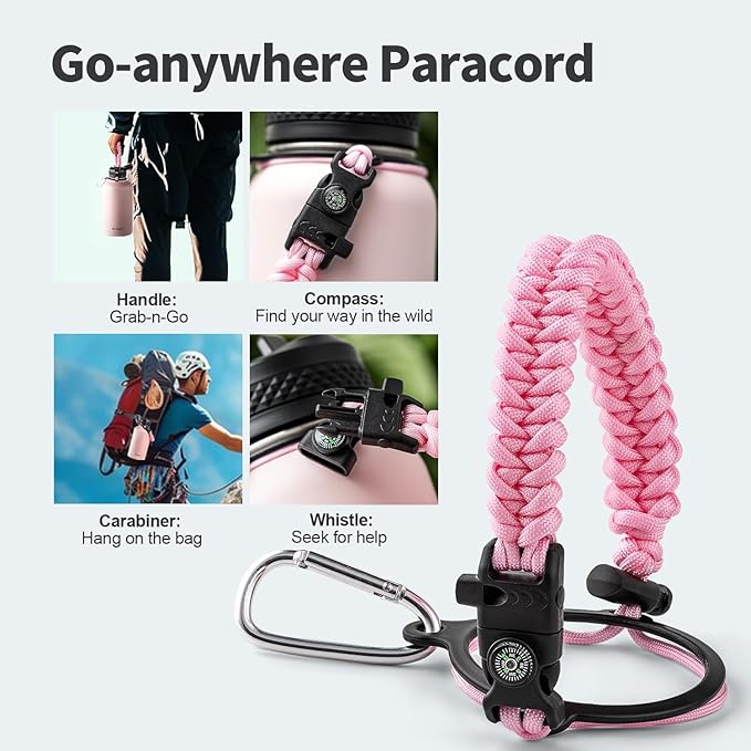• Palm Fitting Paracord Handle: Compared to handle lids, nylon paracord on the bottle gives you more choices in terms of color coordination and coziness on your hands. Match the handle with your bottle to make a complete outdoorsy look. Compass and carabiner can be lifesavers for hiking and other expeditions