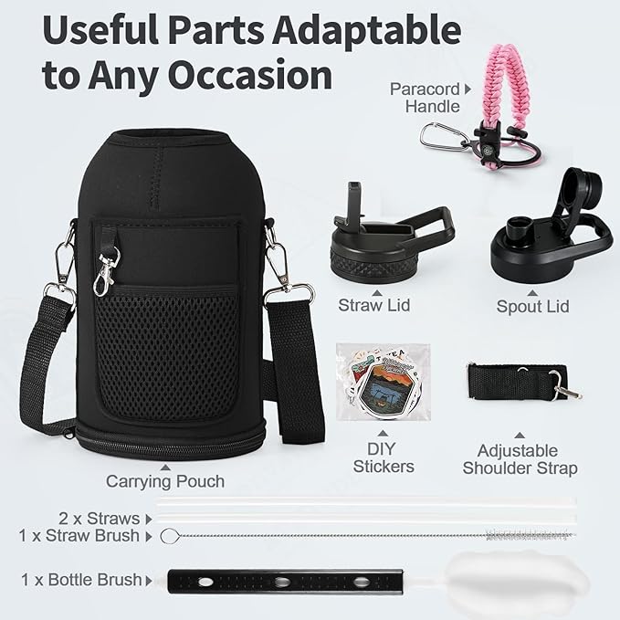 • After Services and Package: We offer continuous after-sales service against leakage and poor cold/hot-keeping capability, we are committed to 100% customer satisfaction. Your purchase includes: WixByti 64oz Water Bottle, Carrying Pouch with Adjustable Strap, Straw Lid with 2 Straws & 1 Straw Brush, Spout Lid, Paracord Handle, Water Bottle Stickers