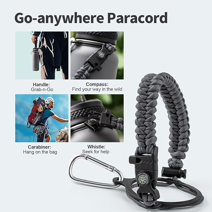 • Palm Fitting Paracord Handle: Compared to handle lids, nylon paracord on the bottle gives you more choices in terms of color coordination and coziness on your hands. Match the handle with your bottle to make a complete outdoorsy look. Compass and carabiner can be lifesavers for hiking and other expeditions