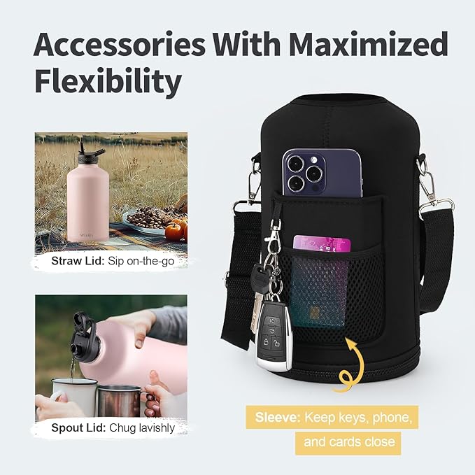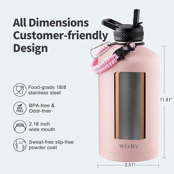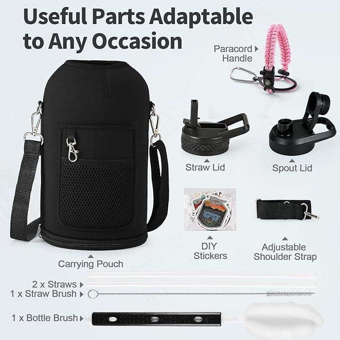 • After Services and Package: We offer continuous after-sales service against leakage and poor cold/hot-keeping capability, we are committed to 100% customer satisfaction. Your purchase includes: WixByti 128oz Water Bottle, Carrying Pouch with Adjustable Strap, Straw Lid with 2 Straws & 1 Straw Brush, Spout Lid, Paracord Handle, Water Bottle Stickers
