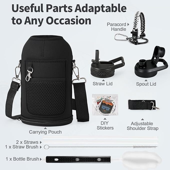 • After Services and Package: We offer continuous after-sales service against leakage and poor cold/hot-keeping capability, we are committed to 100% customer satisfaction. Your purchase includes: WixByti 64oz Water Bottle, Carrying Pouch with Adjustable Strap, Straw Lid with 2 Straws & 1 Straw Brush, Spout Lid, Paracord Handle, Water Bottle Stickers