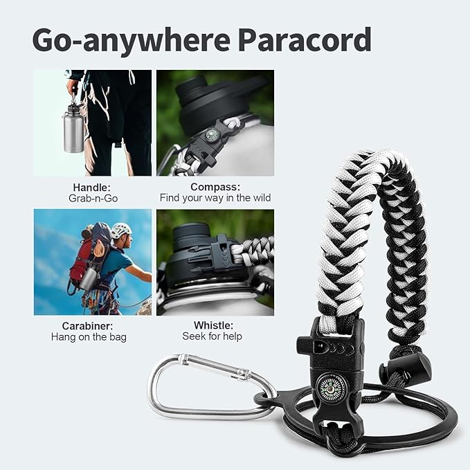 • Palm Fitting Paracord Handle: Compared to handle lids, nylon paracord on the bottle gives you more choices in terms of color coordination and coziness on your hands. Match the handle with your bottle to make a complete outdoorsy look. Compass and carabiner can be lifesavers for hiking and other expeditions