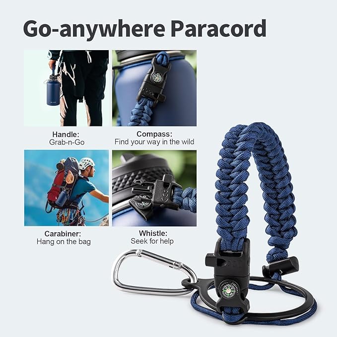 • Palm Fitting Paracord Handle: Compared to handle lids, nylon paracord on the bottle gives you more choices in terms of color coordination and coziness on your hands. Match the handle with your bottle to make a complete outdoorsy look. Compass and carabiner can be lifesavers for hiking and other expeditions