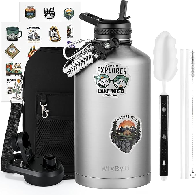 • After Services and Package: We offer continuous after-sales service against leakage and poor cold/hot-keeping capability, we are committed to 100% customer satisfaction. Your purchase includes: WixByti 64oz Water Bottle, Carrying Pouch with Adjustable Strap, Straw Lid with 2 Straws & 1 Straw Brush, Spout Lid, Paracord Handle, Water Bottle Stickers